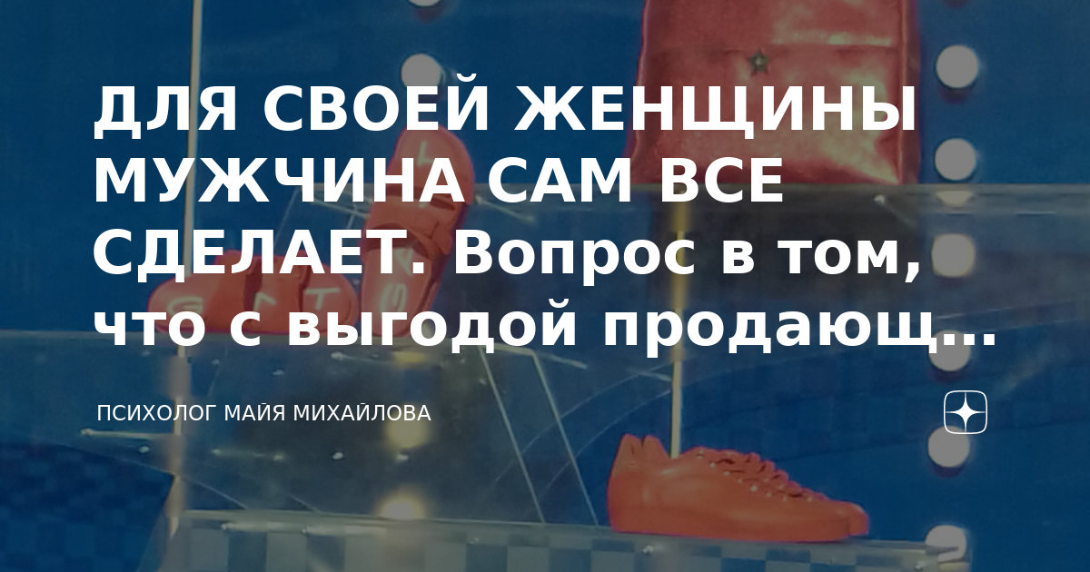 ДЛЯ СВОЕЙ ЖЕНЩИНЫ МУЖЧИНА САМ ВСЕ СДЕЛАЕТ. Вопрос в том, что с выгодой продающая себя и СВОЯ женщина – это ДВЕ РАЗНЫЕ ЖЕНЩИНЫ. Самого доброго Вам времени суток, друзья мои. Товарищи, прошу Вас прокомментировать данный комментарий к моей статье. Александр К. "ДЛЯ СВОЕЙ ЖЕНЩИНЫ МУЖЧИНА САМ ВСЕ СДЕЛАЕТ. Вопрос в том, что с выгодой продающая себя женщина и СВОЯ женщина – это ДВЕ РАЗНЫЕ ЖЕНЩИНЫ" - в 10-ку! Точнее и не скажешь! Только этому надо с детства учить. А у нас на каж...