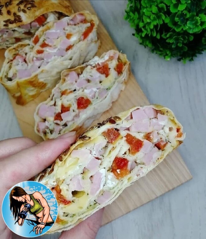 ЛЕНИВАЯ ПИЦЦА В ЛАВАШЕ Ингредиенты: 200гр.армянского бездрожжевого лаваша 50гр.творожного сыра с зеленью 400гр.нежирной ветчины (у меня Империя вкуса из индейки 60гр.сыра 45% 1 крупный помидор 1 яйцо Специи: Сухой чеснок Черный перец Копчёная паприка Сухой укроп Приготовление: Ветчину, помидор порезать на кубики. Лист лаваша смазать творожным сыром, затем выложить ветчину, помидор, потереть сыр, посыпать специями и свернуть рулет. Яйцо взбить и смазать рулет. Выпекать в ра...