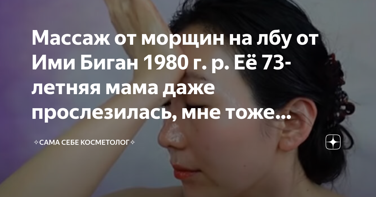 Массаж от морщин на лбу от Ими Биган 1980 г. р. Её 73-летняя мама даже прослезилась, мне тоже понравилось, но с оговорками Ими Биган, как звучит в переводе описания к видео, «родила» новый массажный комплекс от морщин на лбу. Проверила его на своей маме и той понравилось до восторженных слез. Комплекс и на самом деле эффективный. Ими соединила массаж кожи головы с массажем кожи лба, что, согласитесь, даже для Интернета весьма необычно. Мы или апоневроз массируем, или лоб ...