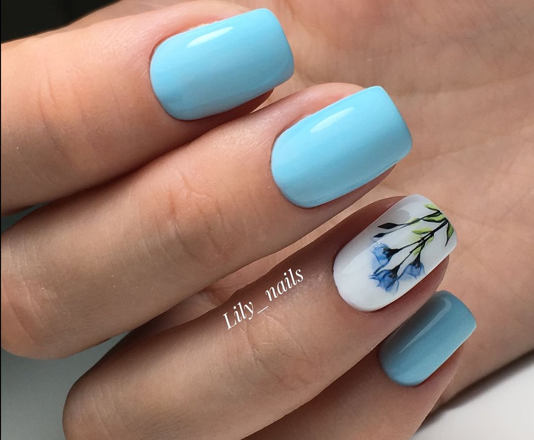 Маникюр с голубыми цветами: 100 фото красивых идей и сочетаний Маникюр с голубыми цветами: 100 фото красивых идей и сочетаний. Модный маникюр с голубыми цветами на короткие и длинные ногти - нежно-голубой, розово-голубой, серо-голубой, бело-голубой, дизайн с блестками, стразами. Лучшие идеи голубого маникюра с цветами на фото.