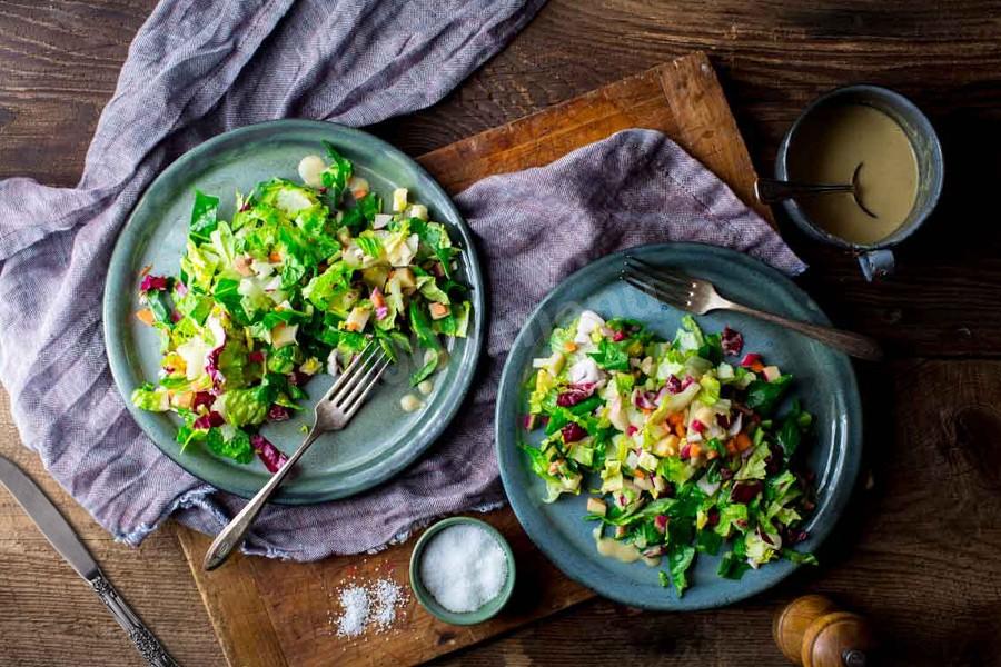 - 1. Яблоко моем, вырезаем сердцевину с семечками, нарезаем кубиками. 2. Морковь и сельдерей очищаем, также режем небольшими кубиками. 3. Редьку очищаем, нарезаем кубиками соразмерно остальным ингредиентам. 4. Радиккьо, листья салата и эскарол моем, обсушиваем, измельчаем ножом. 5. Лук-шаллот очищаем, нарезаем произвольно, выкладываем в чашу блендера. 6. Наливаем в чашу с луком уксус и оливковое масло, добавляем мед, дижонскую горчицу, солим, перчим, взбиваем до однородности. 7. В салатник выкладываем яблоко, морковь, сельдерей, редьку, а также радиккьо, салат и эскарол, поливаем подготовленной заправкой, перемешиваем. Подаем на стол сразу же. Приятного аппетита!