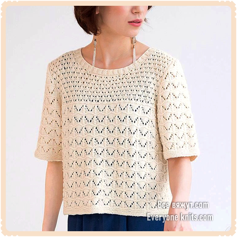 АЖУРНЫЙ ПУЛОВЕР ПРЯМОГО СИЛУЭТА С КОРОТКИМ РУКАВОМ И КРУГЛОЙ ГОРЛОВИНОЙ.Пуловер с втачным рукавом, связан спицами,