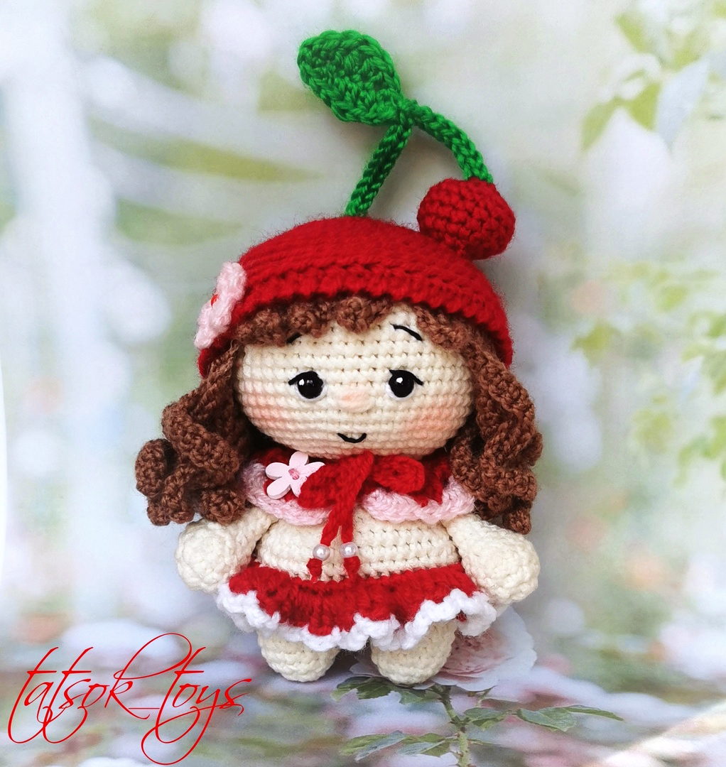 PDF Малышка Вишенка крючком. FREE crochet pattern; Аmigurumi doll patterns. Амигуруми схемы и описания на русском. Вязаные игрушки и поделки своими руками #amimore - маленькая кукла в наряде ягоды вишни, пупс в костюме вишенки, куколка, пупсик, девочка.