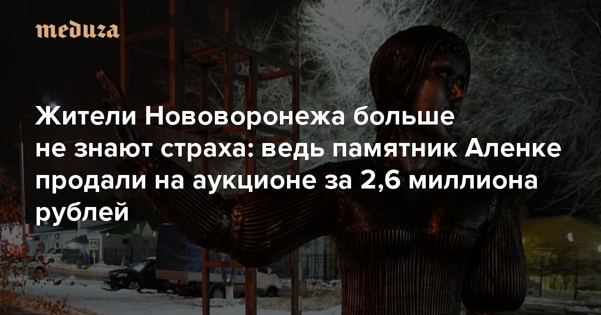 Жители Нововоронежа больше не знают страха: ведь памятник Аленке продали на аукционе за 2,6 миллиона рублей — Meduza Помните памятник ходоку Аленке в городе Нововоронеж? Тот, который местные жители сравнивали с белыми ходоками из «Игры престолов». Так вот — 15 февраля памятник продали с аукциона за 2,6 миллиона рублей.