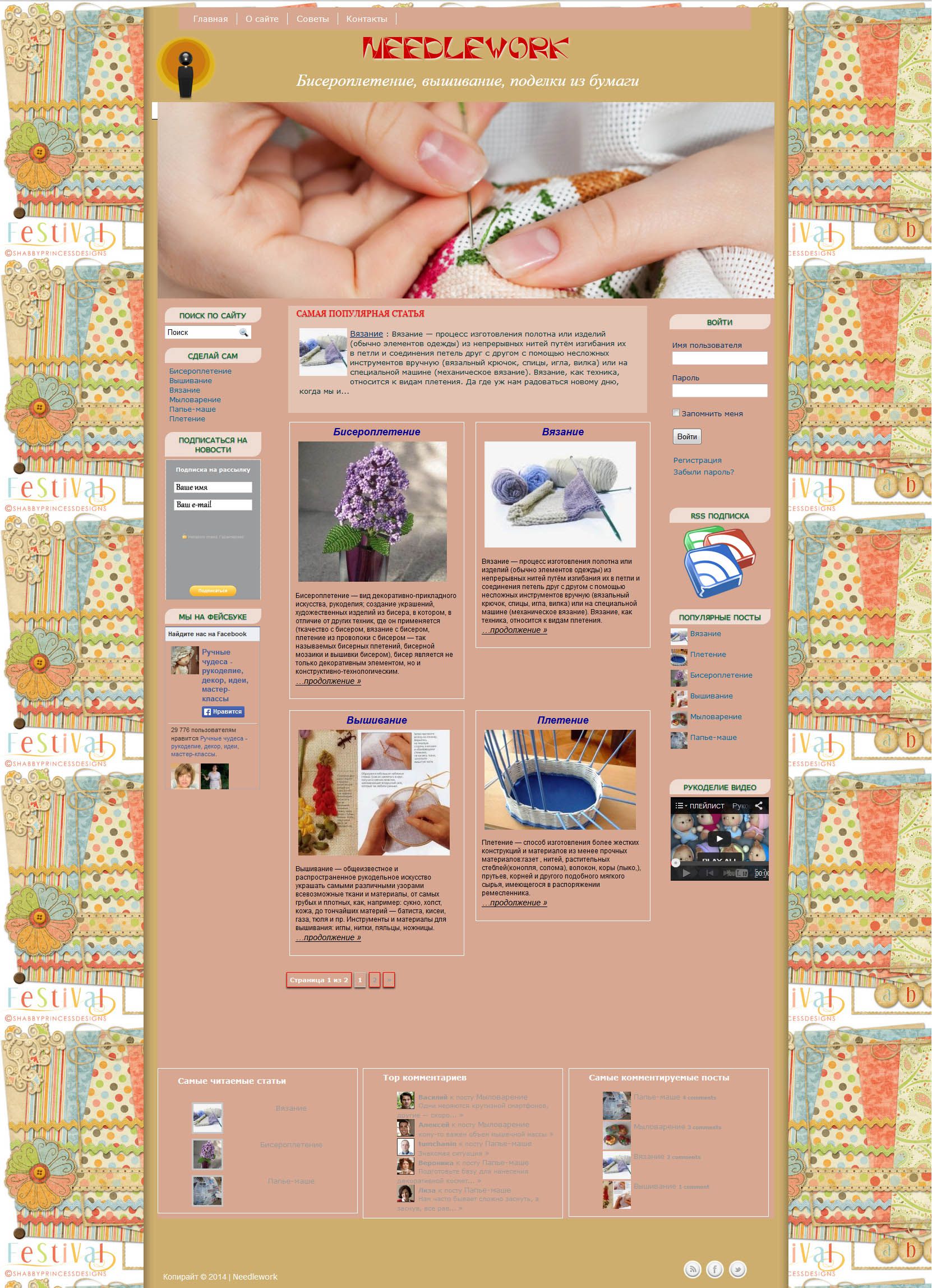 Премиум шаблон wordpress Needlework 2014 Специально для оформления сайта о рукоделии мы разработали шаблон Needlework. Журнальный стиль оформления придает шаблону новый элегантный вид, а информация размещается более компактно. Шаблон Needlework позволяет создать полнофункциональный сайт с регистрацией и авторизацией пользователей. Регистрация/авторизация организована следующим образом. Имеется возможность закрыть от незарегистрированных пользователей любое количество публикаций.