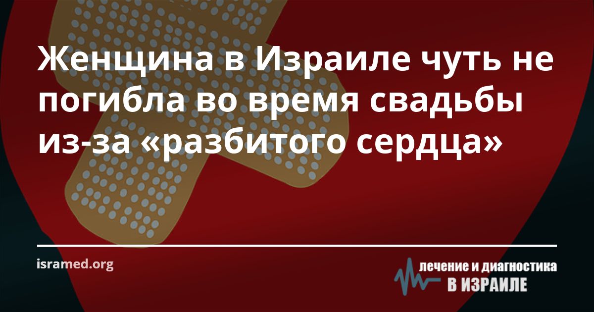Женщина в Израиле чуть не погибла во время свадьбы из-за «разбитого сердца» В приемное отделение скорой клиники приехала жительница Израиля в возрасте 60-ти лет. Она предъявляла жалобы на чувство сильной общей слабости и боли в грудной клетке. Данная симптоматика позволила медикам предположить, что у женщины развилась кардиомиопатия Такоцубо, известная также под названием «синдром разбитого сердца».