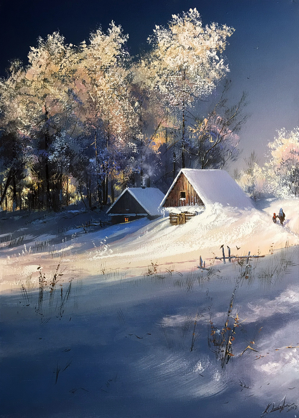 Чародейкою Зимою околдован, лес стоит... Современный художник Юшкевич Виктор Николаевич - мастер пейзажной живописи. Чародейкою Зимушкой, Околдован стоит лес. В ярких красках, в снегу, завьюженном, Затаился волшебный мир чудес. Умиляет меня зимний лес, Красота сказочная не померкла. Припорошены снегом все ветки и лес, И морозные узоры на стекле. Я иду по лесу, словно в сказке. И любуюсь, любовно, красотой. Снегири, как огоньки, на ветке, Словно звезды, сверкают зимой. Вот и солнышко, наконец, …