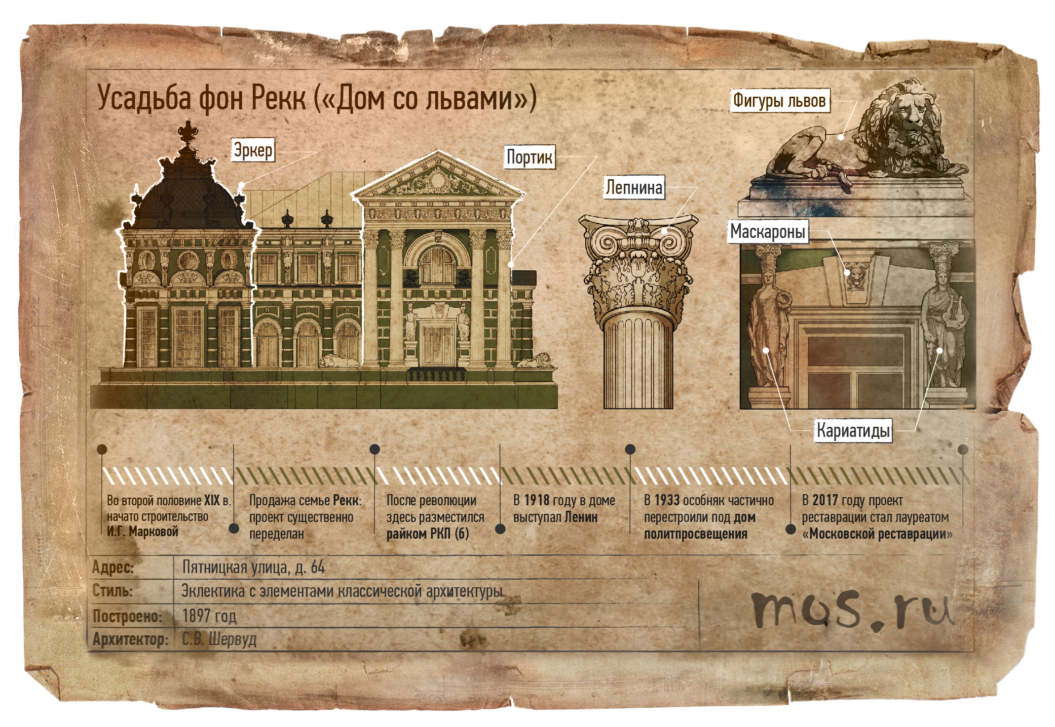 Особняк на Пятницкой появился в 1897 году, однако идея строительства здесь каменной усадьбы родилась задолго до этого. В начале XIX столетия на месте нынешнего Дома со львами находился деревянный дом, который, как и многие другие, сгорел при пожаре 1812 года. До 1836 года участок пустовал, пока его не выкупила титулярная советница Ирина Маркова, которой и принадлежит проект постройки усадьбы.