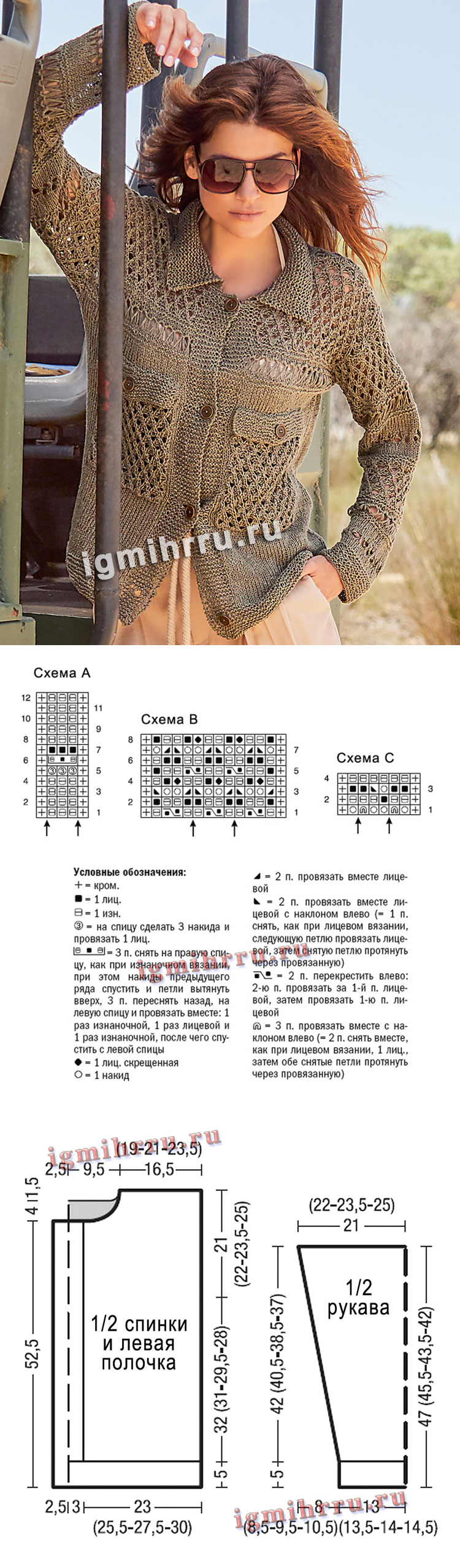 Ажурный льняной жакет в стиле сафари. Вязание спицами со схемами и описанием