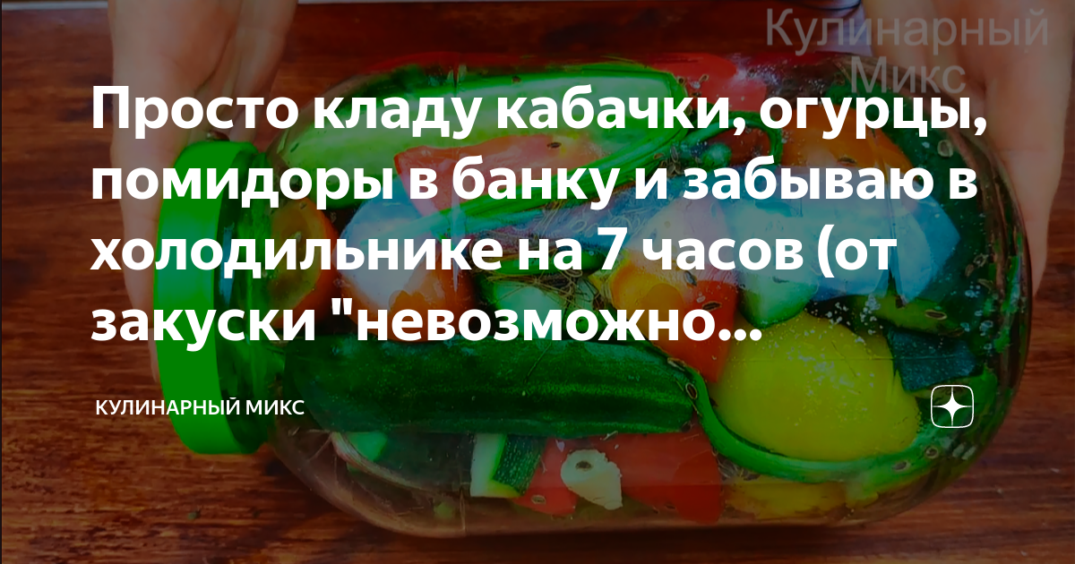 Просто кладу кабачки, огурцы, помидоры в банку и забываю в холодильнике на 7 часов (от закуски "невозможно оторваться", вкусно) Ингредиенты: