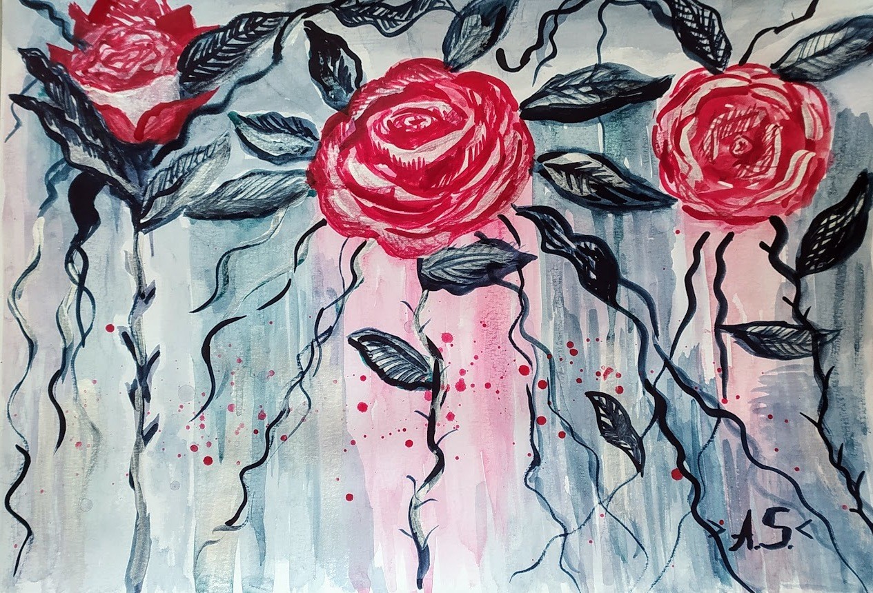 🌹 Scarlet Roses In Indigo Leaves Waterco, Картина - Yana Lee | Artmajeur Купить искусство от Yana Lee (Бесплатная доставка, Безопасная прямая покупка): Картина под названием "🌹 scarlet roses in indigo leaves watercolour painting 🌹"