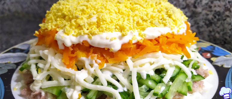 Отличный салат с тунцом Этот салат всем хорош. Из недорогих обычных продуктов получается так вкусно! Хоть он и слоёный, но для сборки можно даже кольцо или форму не использовать, все продукты укладываются очень легко.