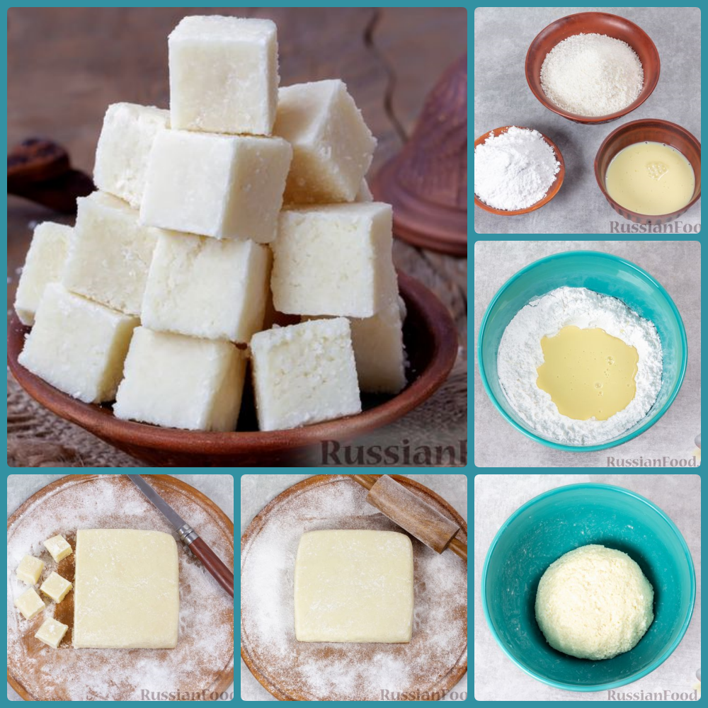 Кокосовый десерт со сгущённым молоком Продукты (на 1 порцию) Кокосовая стружка - 200 г Сгущенное молоко - 250 г Сахарная пудра - 250 г + 10-20 г на подплыл