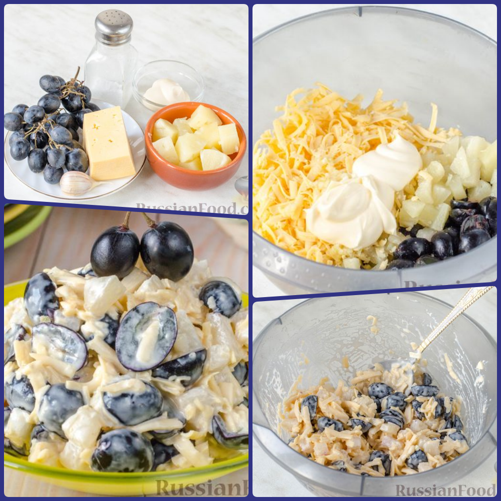 Салат с ананасами, сыром и виноградом Ананасы консервированные - 100 г Виноград - 100 г Сыр твёрдый - 100 г Чеснок - 1-2 зубчика Майонез - 2 ст. ложки Соль - по вкусу