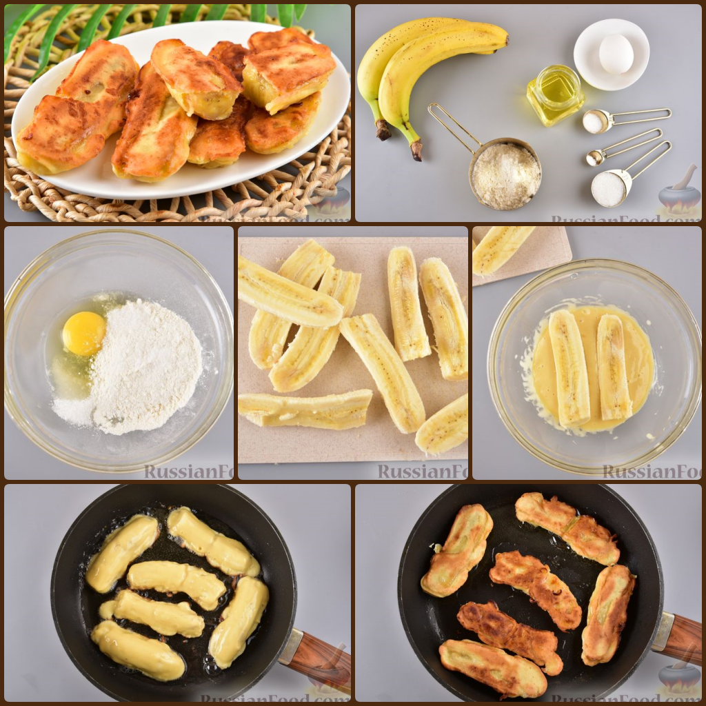 Бананы, жаренные в кляре Бананы - 2 шт. Мука пшеничная - 2 ст. ложки Яйцо - 1 шт. Сахар - 1 ч. ложка Ванильный сахар - 1 ч. ложка Соль - 1 щепотка Масло растительное (для жарки) - 3 ст. ложки