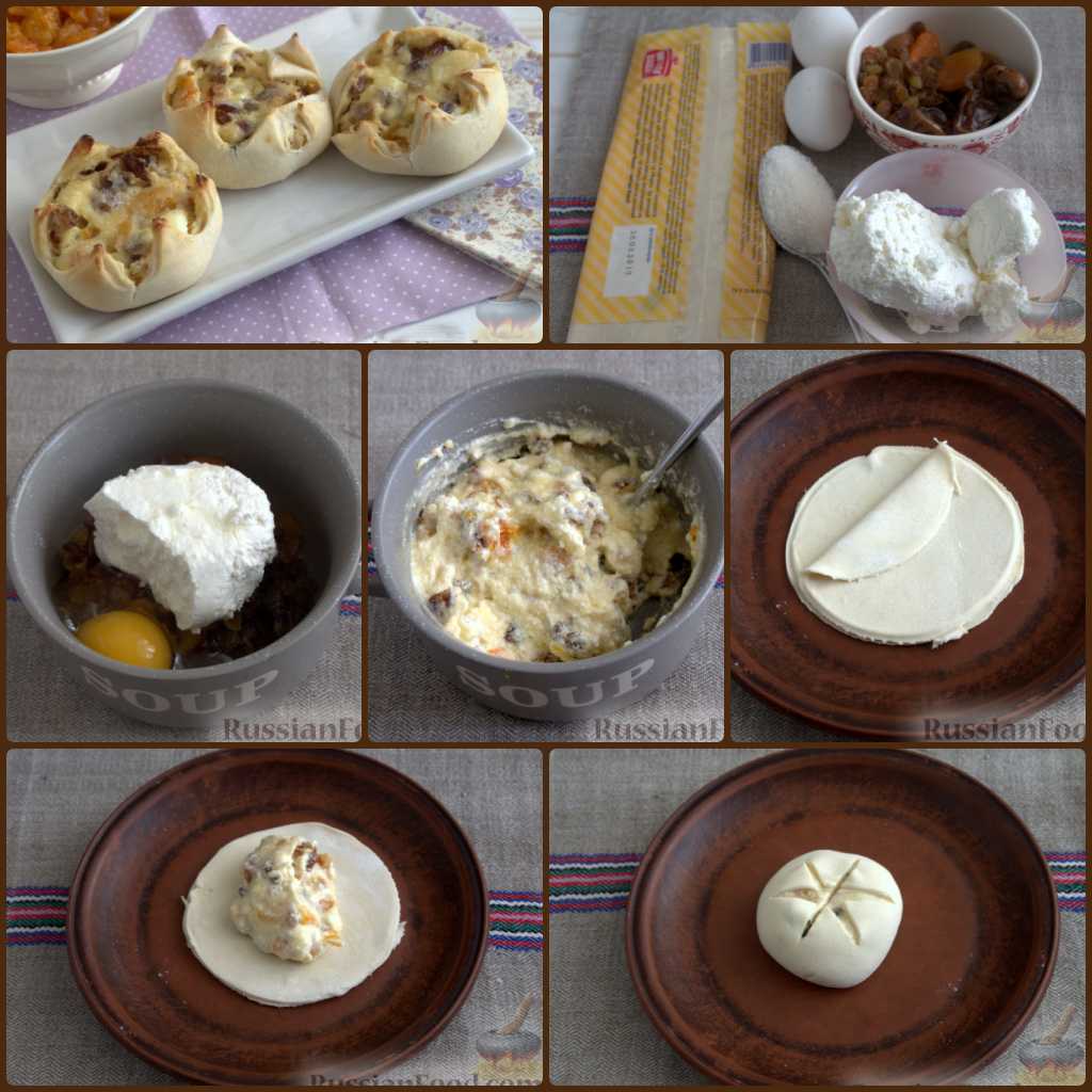 Пирожные «Лотосы» с творогом и сухофруктами Тесто слоеное - 400-500 г Курага - 3-5 шт. Чернослив - 3-5 шт. Финики - 3-5 шт. Изюм - 1-2 ст. ложки Творог - 250 г Сахар - 2-3 ст. ложки Яйца - 2 шт.