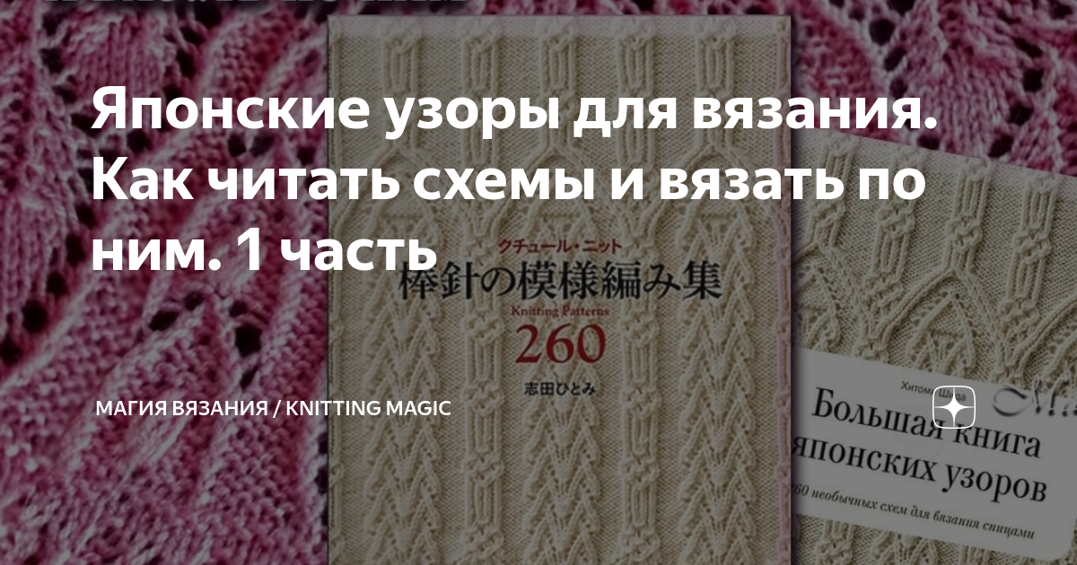 Японские узоры для вязания. Как читать схемы и вязать по ним. 1 часть Бесценная информация для тех, кто приобрел японские книги и журналы по вязанию и не знает, что с ними делать ))) С нами вы научитесь легко и быстро вязать японские узоры! Подробное объяснение и показ условных обозначений из японских книг на примере знаменитой книги Хитоми Шида. Ещё совсем недавно я смотрела на японские узоры со смешанным чувством: восхищение (это божественно!), зависть (кто-то же