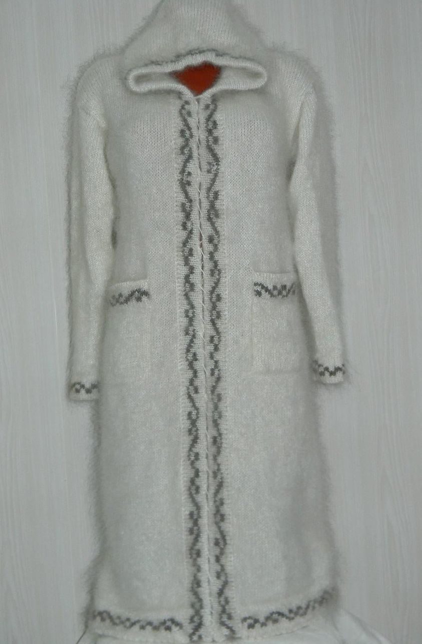 Белое пуховое пальто с капюшоном. Связано из натурального чесаного козьего пуха ручного прядения с орнаментам, очень нежное, теплое, мягкое и элегантное.