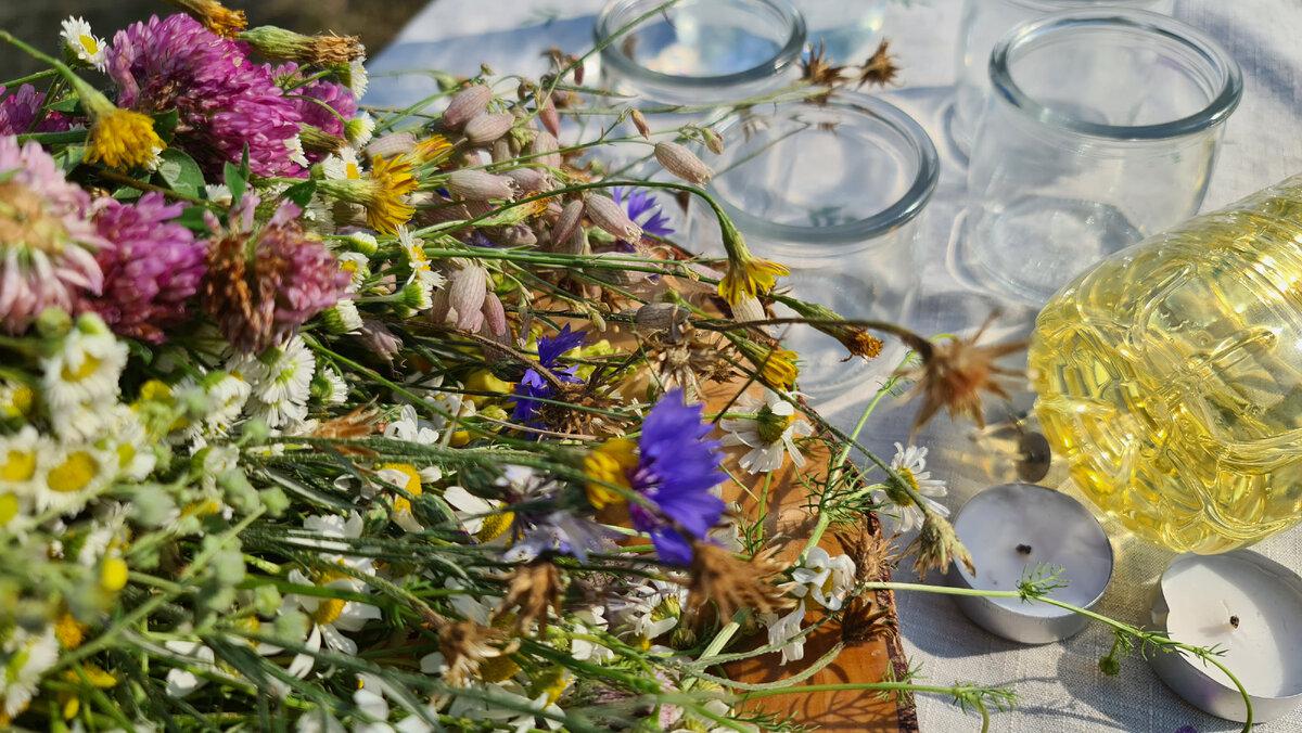 Ну вот и ненужные баночки пригодились: наполнили их полевыми цветами, водой, маслом и… подожгли