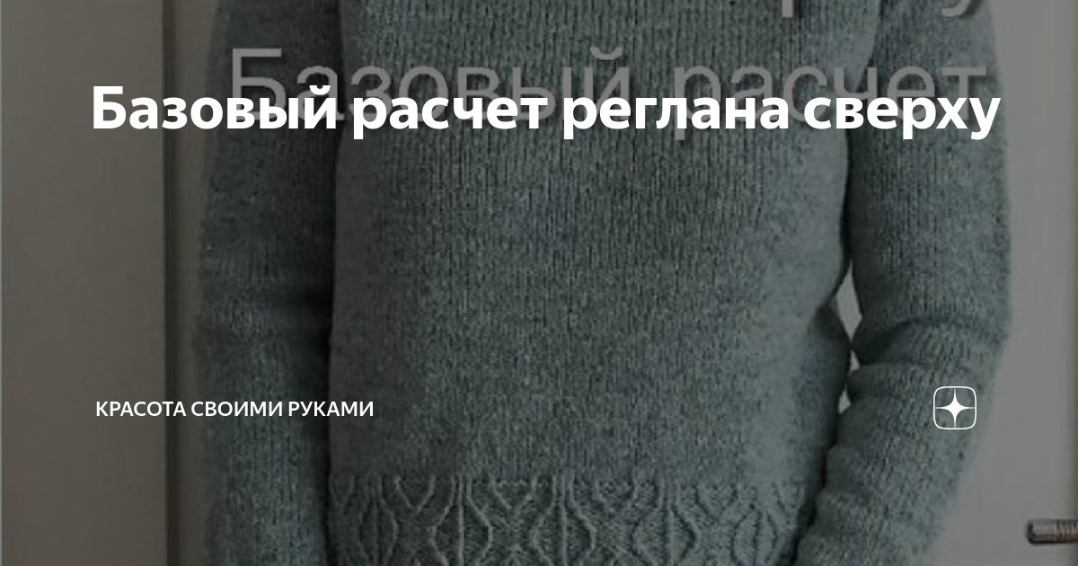 Базовый расчет реглана сверху Какой для вас самый простой способ вязания свитера? По мне так это реглан сверху. Вязать его можно разными узорами и заковыристыми прибавками, но суть остаётся одна: нужно определить плотность и рассчитать , сколько петель будет в начальном ряду горловины. Делаем расчёт Допустим, у вас 104 петли горловины. Сразу вычитаем 8 — по 2 петли на каждую линию реглана. Перед и после этих петель будем делать прибавки по 1 петле в каждом втором ряду. П...