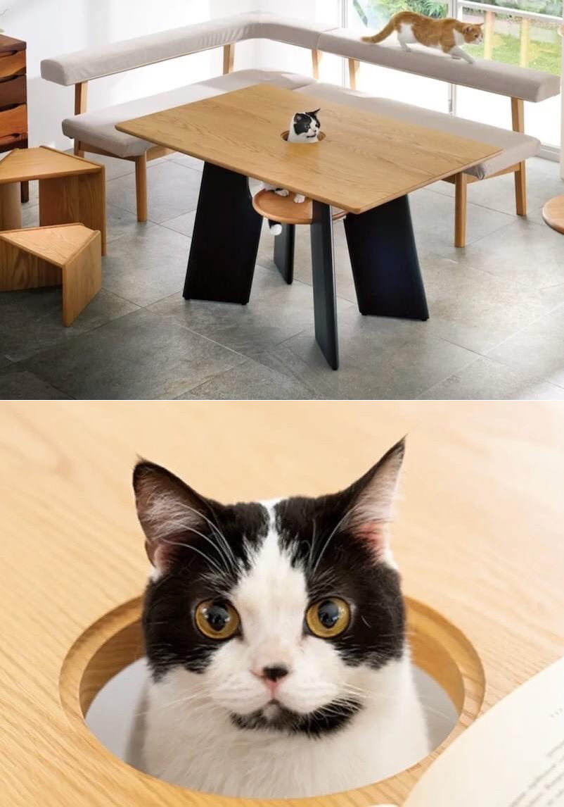 Home / Twitter Японская компания начала выпуск специального стола для любителей кошек. Его особенность: специальная подставочка в в центре и лаз.