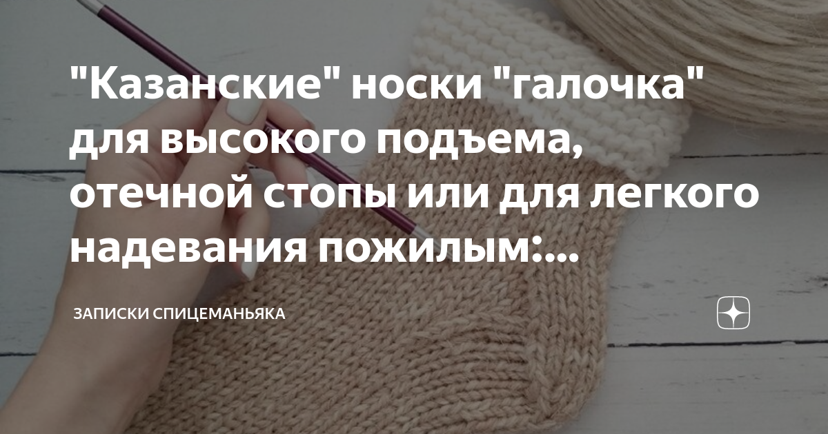 "Казанские" носки "галочка" для высокого подъема, отечной стопы или для легкого надевания пожилым: инструкция Вяжущая очень дальняя родственница в летах, живя под Казанью в деревне, со своим личным хозяйством, из своих овец несколько лет назад связала нам носки. Не раз разглядывала их технику вязания без задних мыслей, просто восхищалась необычностью убавок и знатной шириной в подъеме (которая и мужу супер широкая). Полезла в книгу "Гениальные носки", зря что ли столько де...