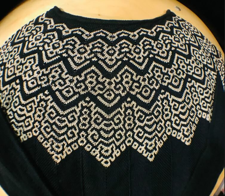 Кофточка с круглой кокеткой ленивым жаккардом. Чёрное с золотом | Mария Mоскалева | Яндекс Дзен
