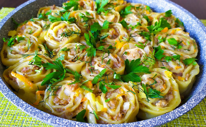Собираем фарш с тестом в рулет и тушим как пельмени. Получается быстрее, но гораздо вкуснее пельменей