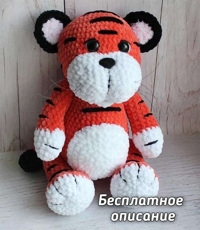 Бесплатная схема вязания плюшевого тигрёнка крючком. Автор - @leluza_knitting. Размер амигуруми - 30 см Пряжа Schachenmayr Original Merino Coton 100г. - 550м. Для Тигрёнка нам понадобится: Крючок 2,5 мм. Спицы 4 мм. Игла для сшивания. Наполнитель - синтепон. Приступаем к вязанию. 1. Голова. 2 ряда столбиками без накида. 2. 2 ряда по 15 столбиков без накида в каждом (то есть 15 рядов).