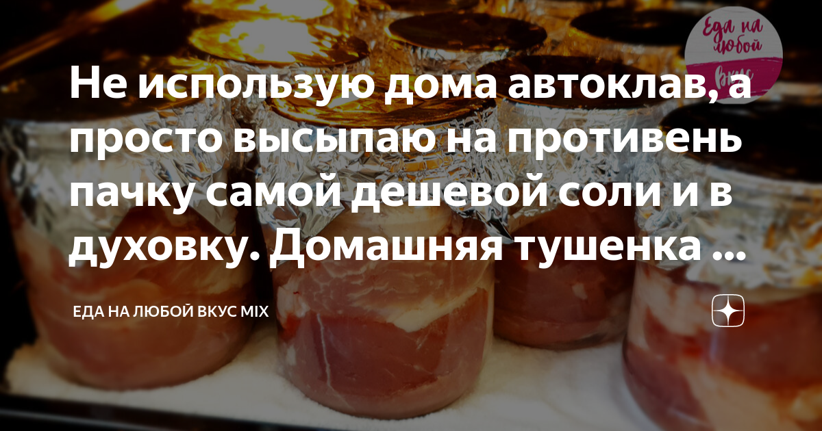 Не использую дома автоклав, а просто высыпаю на противень пачку самой дешевой соли и в духовку. Домашняя тушенка из любого мяса. Главное-не переборщить. Я не варю мясо часа 4, не меньше, потом в холодильник.