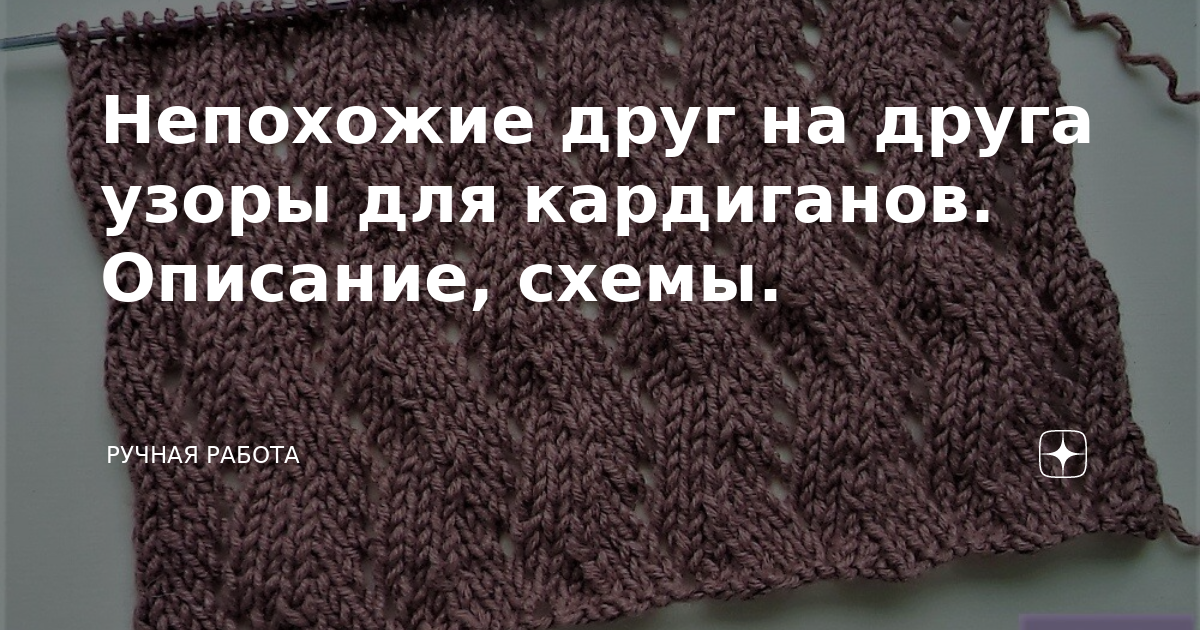 Непохожие друг на друга узоры для кардиганов. Описание, схемы. Предлагаю вниманию вязальщиц два узора, которые очень хорошо подходят для, например, кардиганов. Но, не только кардиганы можно вязать такими узорами. Узор №1 Этот узор достаточно плотной вязки. Подходит, если хотите связать кардиган или жакет для холодной погоды. Неплохо будут смотреться и шапочки, свитеры. Описание вязания. Раппорт узора равен 2 петлям по ширине и 2 рядам по высоте вязания. Количество петель д...