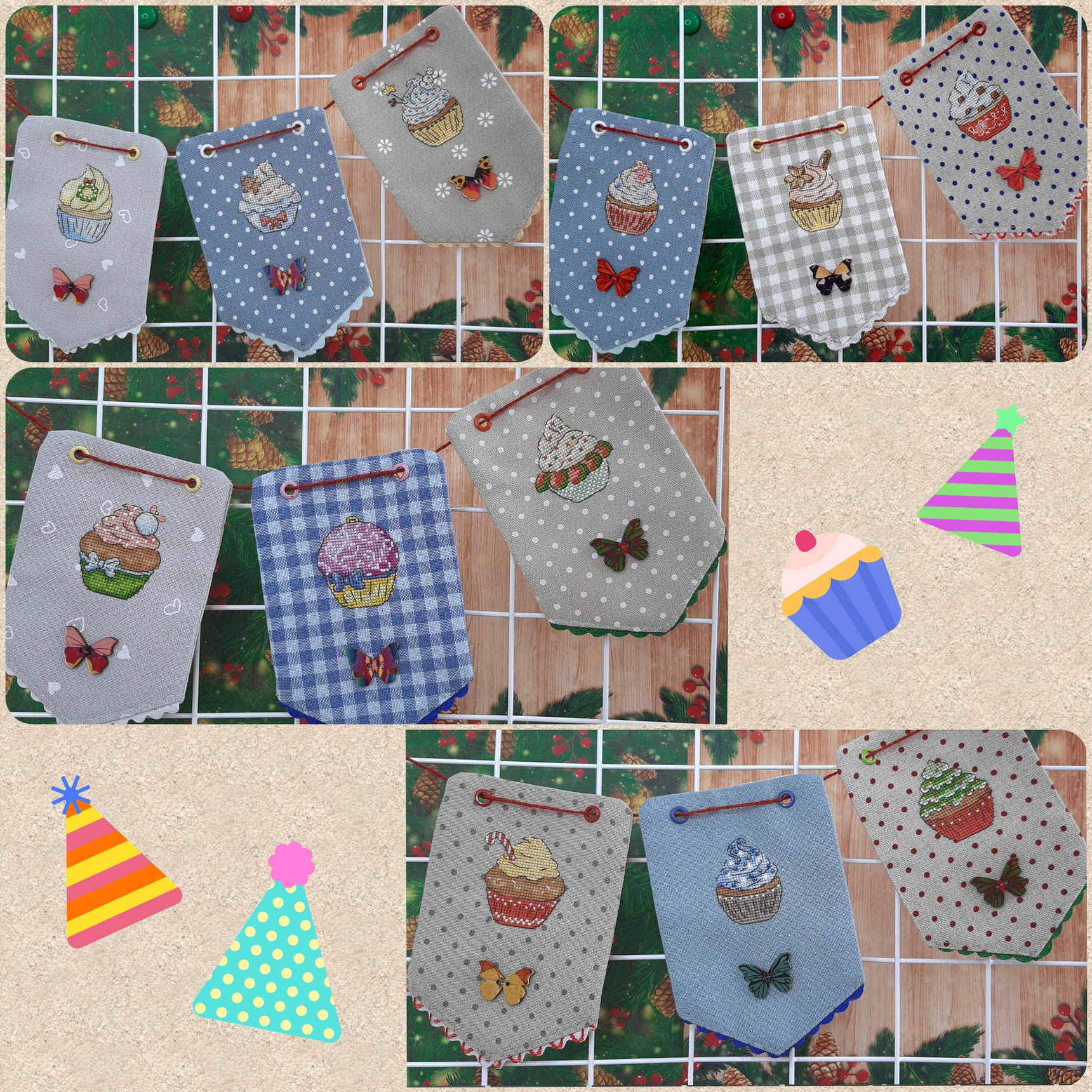 Купить вышивку крестом, праздничное украшение детской, рождественский декор - Текстильная гирлянда из флажков "Новогодние кексы" для украшения детской комнаты. Новогодняя гирлянда с кексами и пирожными.