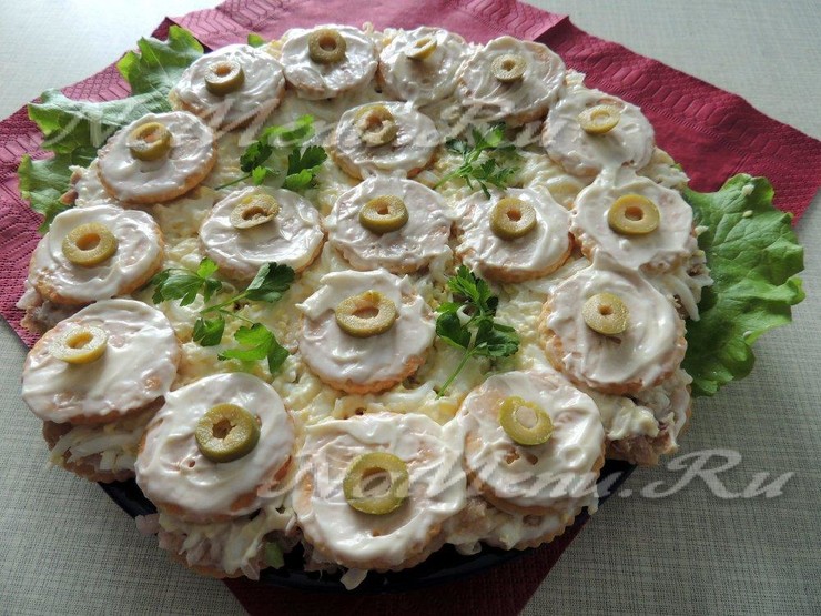 Закусочный торт из крекеров и консервы, рецепт с фото