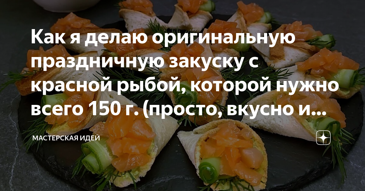 Как я делаю оригинальную праздничную закуску с красной рыбой, которой нужно всего 150 г. (просто, вкусно и без майонеза) Сегодня я хочу предложить вашему вниманию оригинальный вариант простой, красивой и очень вкусной праздничной закуски, на приготовление которой не потребуется много времени и труда. Такая закуска выглядит на столе красиво и эффектно и при этом красной рыбы нужно всего лишь 150 г. Попробуйте, вам понравится! Необходимые ингредиенты и видеорецепт вы можете ...