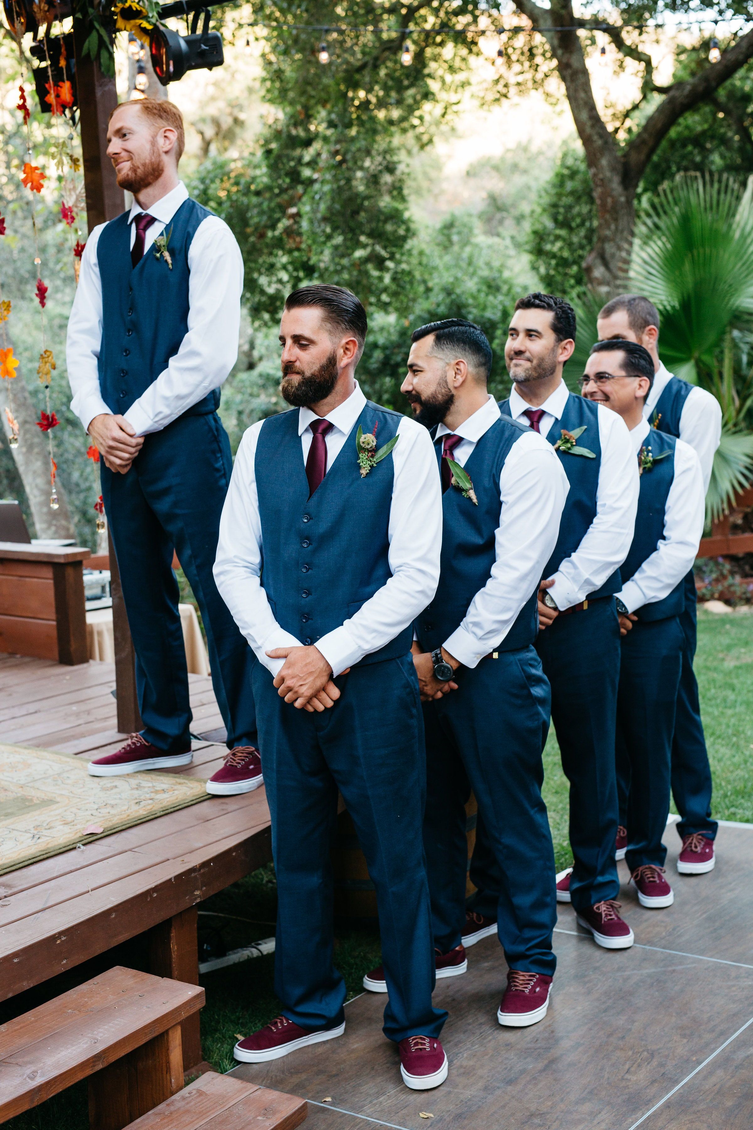 Groomsmen | The couples love for all things Autumn made October the perfect month for their wedding day. Rich Autumn hues such as burgundy & copper created a warm romantic vibe at Dancing Oaks Ranch in Ojai, CA. The fall wedding ceremony backdrop used autumn leaves & tiny mirrors on twine. Copper flatware matched with mismatched goblets in shades of purple, green & orange were perfection. #JAE #JaneAlexandraEvents #weddingplanning #fallweddingideas #ojaiweddingvenues #venturawedding