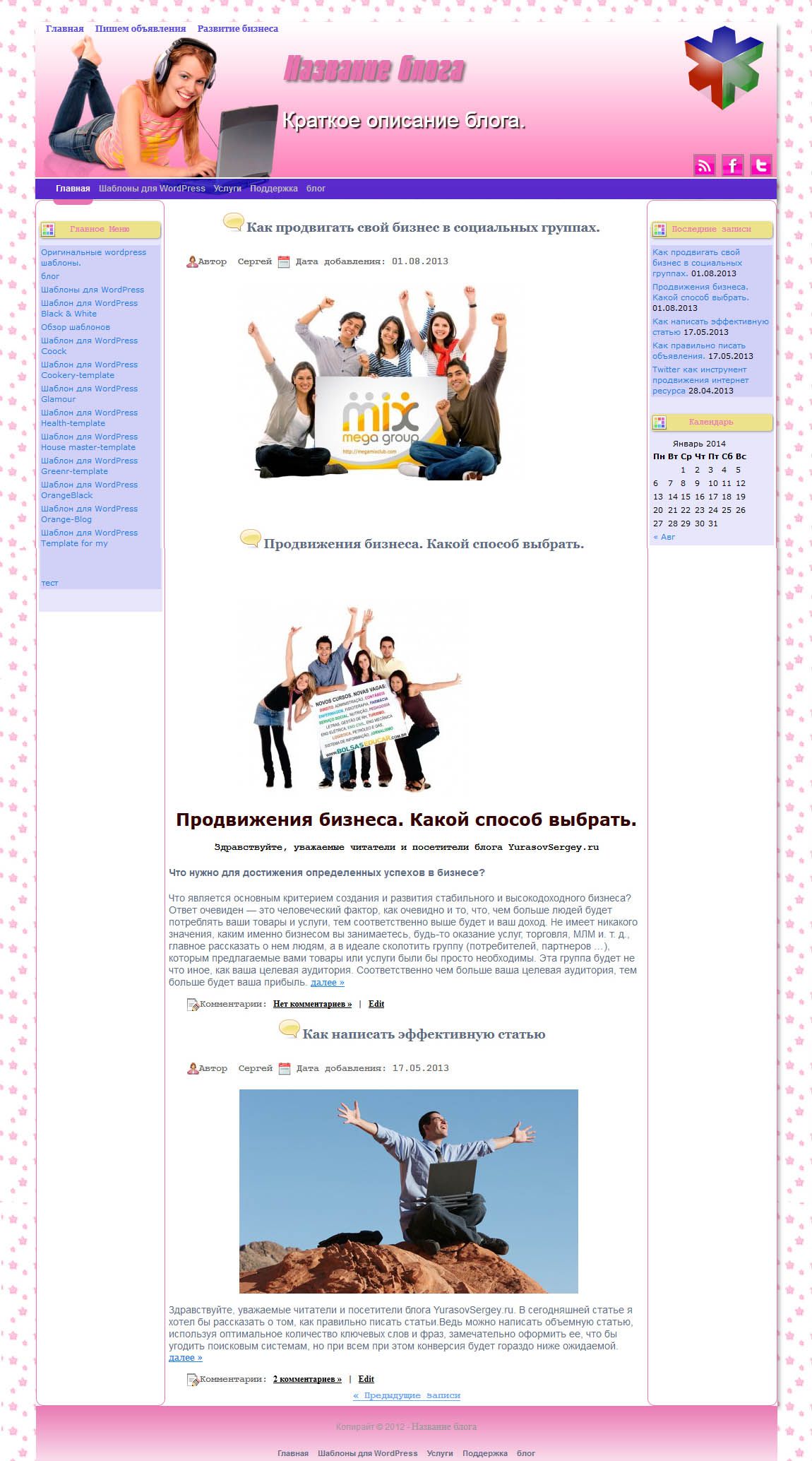 Креативный дизайн этого шаблона позволяет оформить блог на котором рассказывается о разных женских “штучках”, макияж, косметика, бижутерия, обмен мнениями. Трех колоночный дизайн позволяет использовать большее количество виджетов для расширения возможностей блога. Оригинальное, “живое” меню, сделанное на jQuery и CSS, предаст еще больше индивидуальности вашему блогу.