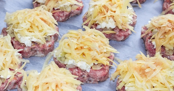 Что сделать из половины килограмма фарша и сырого картофеля Когда обычные котлеты уже надоели, да и мясного фарша осталось совсем немного — я чищу 4 картофелины, несколько луковиц и достаю из холодильника сыр и майонез, чтобы приготовить это блюдо.