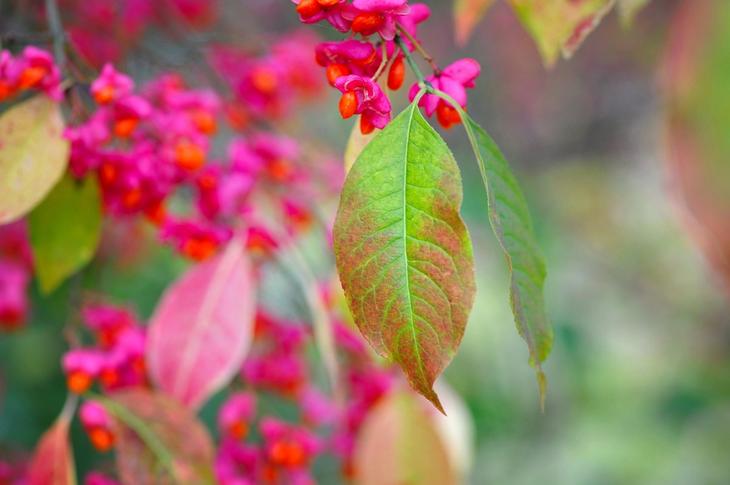 Бересклет не нуждается в формирующей обрезке, поэтому идеально подходит для начинающих садоводов. Это нетребовательное растение летом особо ничем не выделяется, зато осенью переодевается в яркий наряд в розовых, красных и пурпурных оттенках. Кроме того, красивые осенние листья дополняют плоды необычной формы.