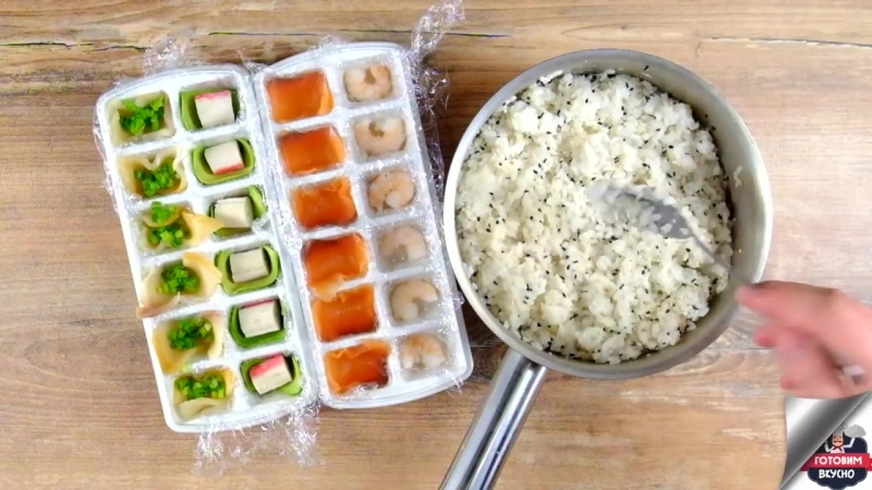 Запись на стене Как приготовить суши-кубики? Рецепт от "Готовим вкусно" 1. Отварные креветки 6шт.2. Семга слабосоленая 40г.3. Авакадо 40г.4. Крабовые палочки 3шт.5. Масляная копченая 40г.6. Зеленый лук 1ст.л.7. Отваренный рис 300г.8. Рисовый уксус 25мл.9. Сахар 1/2 ч.л.10. Кунжут 2ст.л