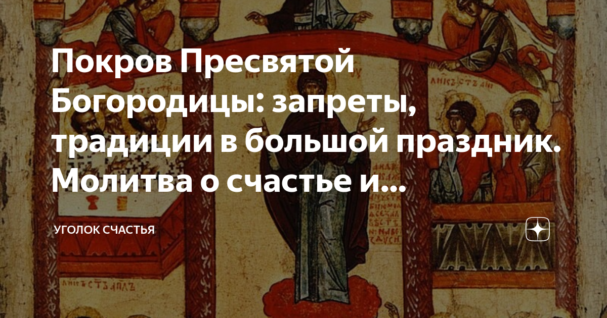 Покров Пресвятой Богородицы: запреты, традиции в большой праздник. Молитва о счастье и благополучии, защите от бед 14 октября нас ждет добрый, наполненный любовью Богородицы, день: праздник Покрова Пресвятой Богородицы. В каждом доме есть икона Покрова, которая укрывает дом и семью от бед всяческих. И чтобы иконка помогала всегда, нужно не забывать молиться, не только в праздники, но постоянно. Особенно замечено, что молитва пред иконой Покрова Пресвятой Богородицы помогае...