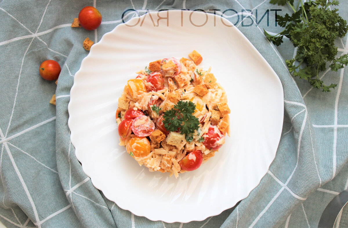 Вспомнила классный рецепт праздничного салата (варить и чистить ничего не нужно). Теперь готовлю часто У нас такой же в столовке подают, только без кальмаров.