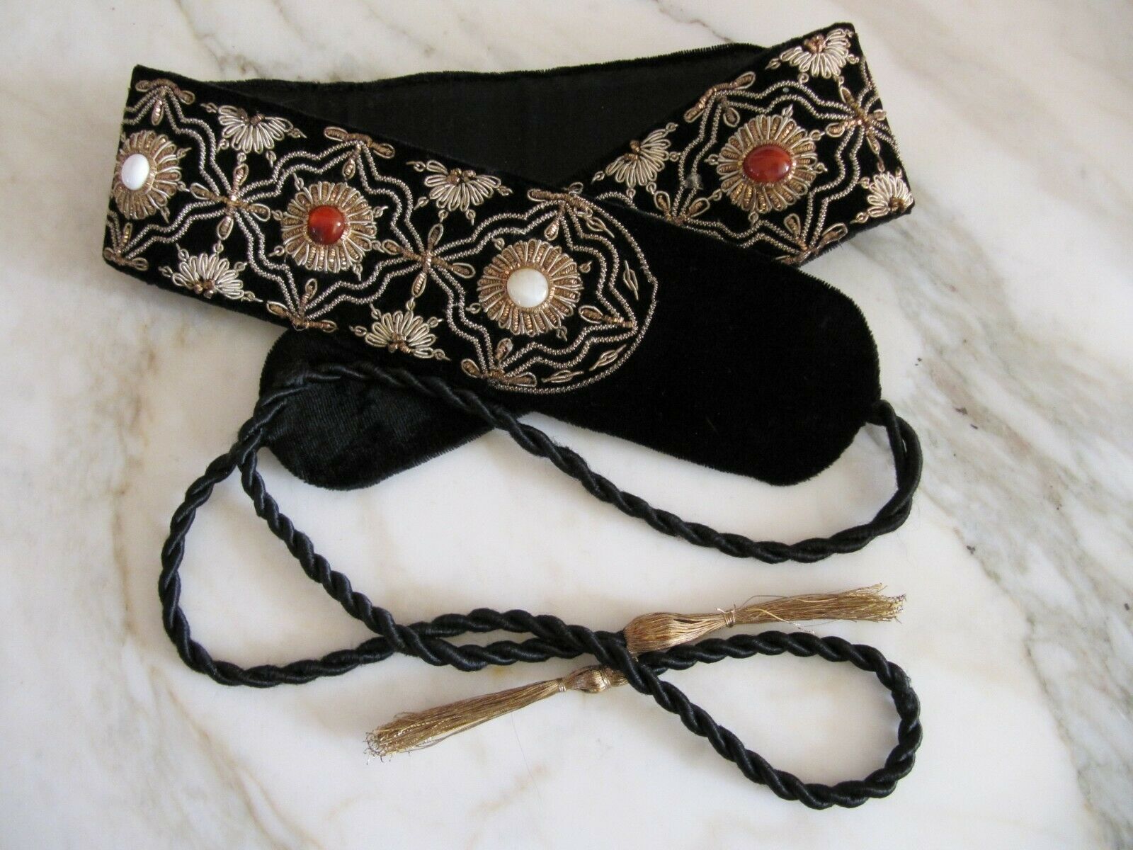 Vintage India Gold Metallic Embroidered Velvet Belt with Semi Precious Stones Product on Gem