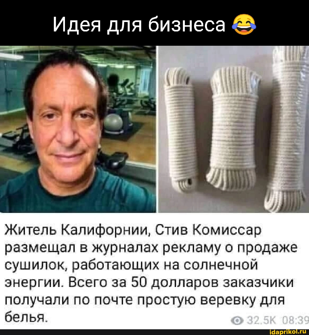Идея для бизнеса Житель Калифорнии, Стив Комиссар размещал в журналах рекламу о продаже сушилок, работающих на солнечной энергии. Всего за 50 долларов заказчики получали по почте простую веревку для белья. - ) / АйДаПрикол .)