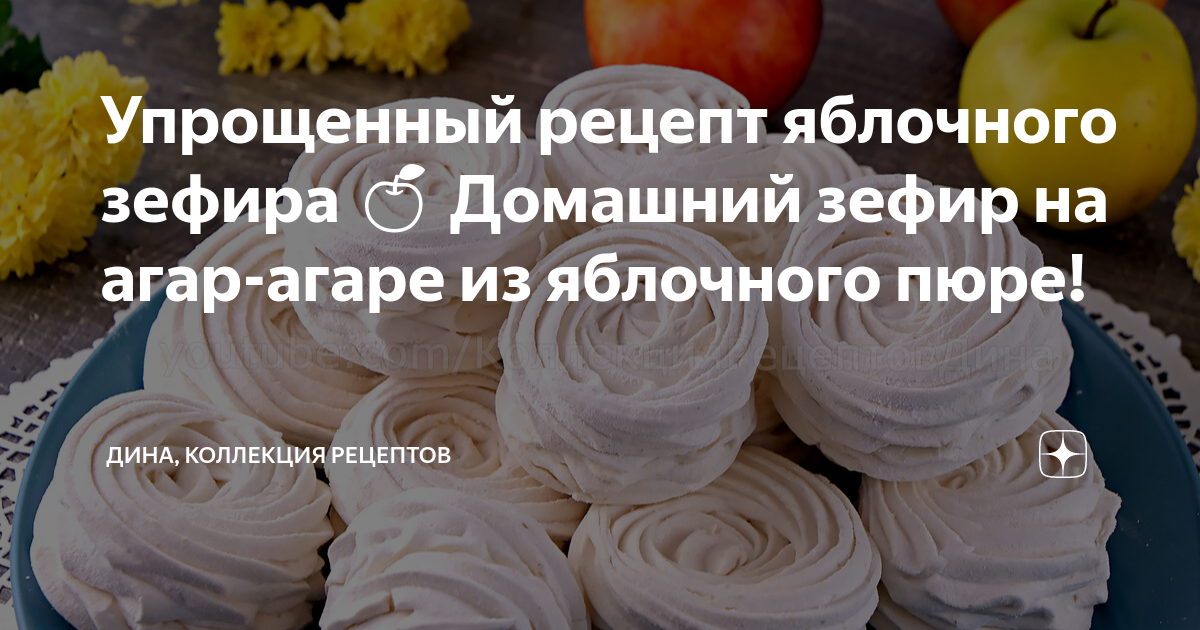 Упрощенный рецепт яблочного зефира 🍏 Домашний зефир на агар-агаре из яблочного пюре! Друзья мои, всем привет! С вами Дина и канал "Коллекция Рецептов". Существует масса вариантов приготовления яблочного зефира - на густом яблочном пюре, с использованием домашнего повидла или детского яблочного пюре, на основе пектина, агар-агара, желатина, без яиц, и даже с медом вместо сахара. Сегодня я готовлю упрощенный рецепт домашнего яблочного зефира на основе натурального яблочного...