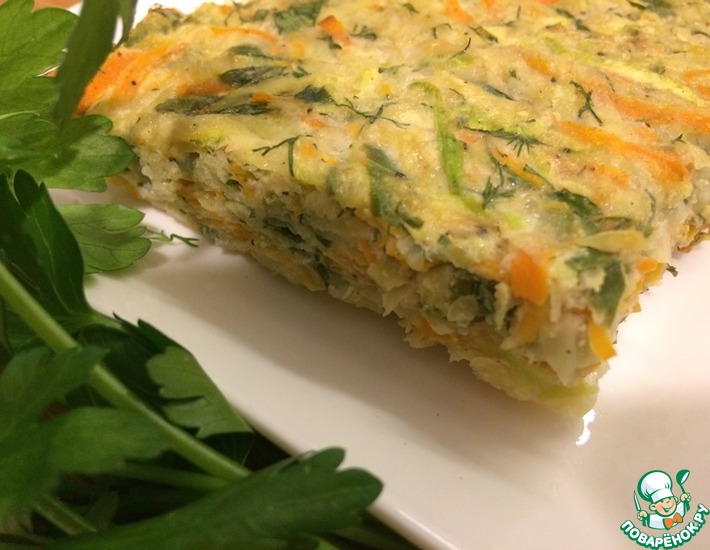 - Количество ингредиентов дано на форму 18*18. Все овощи берем среднего размера, моем, чистим. Если у кабачка шкурка тонкая, то натираем его вместе с ней на крупной терке. Немного солим и отставляем в сторону (он должен пустить сок). Натираем картофель и промываем водой. Трем морковку, режем зеленый лук, укроп и петрушку. За это время кабачок пустил сок, отжимаем его. Смешиваем все натерто-нарезанные овощи, добавляем яйцо, подсолнечное масло, солим-перчим по вкусу. Добавляем муку, она может быть любая, мне нравится кукурузная. Под размер нашей формы отрезаем пекарскую бумагу и мнем ее руками в комок. Это нужно для ее мягкости и максимального заполнения бумагой формы. Выстилаем форму бумагой. Выкладываем овощную смесь. Запекаем в духовке при 200 градусах 30 минут. Готовую запеканку можно посыпать тертым сыром. Приятного аппетита!