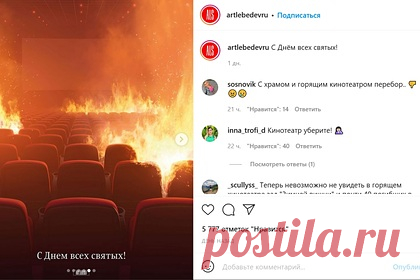 Открытку дизайнерской компании «Студия Артемия Лебедева», опубликованную к Хеллоуину в Instagram, назвали спекуляцией на трагедии. Такое мнение выразили пользователи соцсети в комментариях к публикации. Пост содержит несколько изображений, которые сопровождаются подписью «С Днем всех святых». По мнению комментаторов, картина, на которой изображен горящий зал кинотеатра, ассоциируется только с пожаром в торговом центре «Зимняя вишня» в Кемерове. «Я не знаю, кем надо быть, чтобы поместить изображение горящего кинозала среди тыквенных рожиц(( Тут, по-моему, только одна ассоциация у жителей нашей страны может быть... Это спекуляция на трагедии, низко», — написала юзер с ником manyashagrin. Другие пользователи согласились с этим. «Теперь невозможно не увидеть в горящем кинотеатре зал "Зимней вишни" и почти 40 погибших в этом неописуемом ужасе детей», «Горящий кинотеатр — за гранью», — пишут пользователи. Пожар в ТРЦ «Зимняя вишня» произошел 25 марта 2018 года. В результате трагедии погибли 60 человек, в том числе 37 детей. Возгорание произошло из-за протекающей крыши: вода залила светильник и произошло замыкание. В здании ТРЦ не работала пожарная сигнализация, а также не функционировали пожарные выходы.