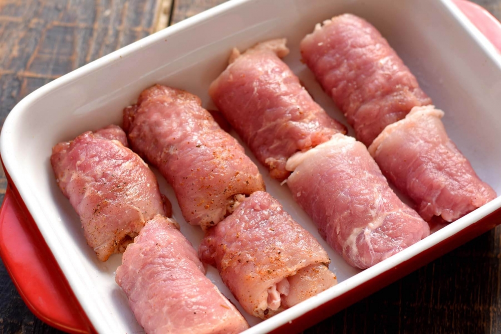Мясные рулетики с маринованными огурцами Если вам надоели привычные мясные котлеты или отбивные, приготовьте вкусные рулетики из мяса с начинкой. Для этого отлично подойдет мякоть свинины, она нарезается на порционные куски, которые отбиваются, маринуются и скручиваются в небольшие рулеты. В качестве начинки используем маринованные огурчики. Запекаются рулетики под сырной корочкой, получаются очень нежными и сочными, имеет пикантный вкус за счет маринованных огурцов.