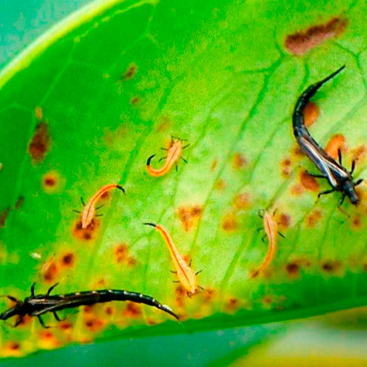 Вредитель комнатных растений Трипс. Это небольшие насекомые длиной 0,5-2 мм с тонким телом от желтоватого до черного цвета. Личинки длиной до 1 мм желтовато-белой окраски. Взрослые особи способны перелетать на сравнительно большие расстояния. Трипсы селятся на надземных частях комнатных культур колониями. Яйца откладывают внутри мягких тканей листьев. Обнаружить насекомых можно чаще на обратной стороне листовых пластинок. Взрослые вредители и личинки высасывают сок из листьев.