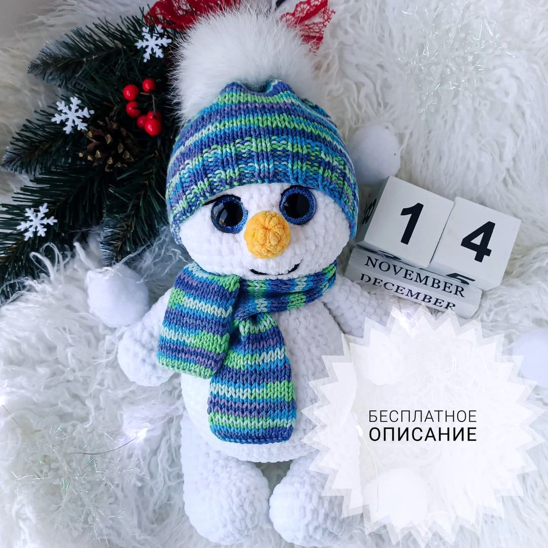 PDF Снеговичок Лени крючком. FREE crochet pattern; Аmigurumi toy patterns. Амигуруми схемы и описания на русском. Вязаные игрушки и поделки своими руками #amimore - плюшевый снеговик к Новому году, большой снеговичок из плюшевой пряжи в шапочке и с шарфом.