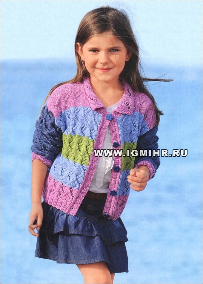 Кофточка в полоску с ажурным узором, для девочки 5-11 лет. Спицы